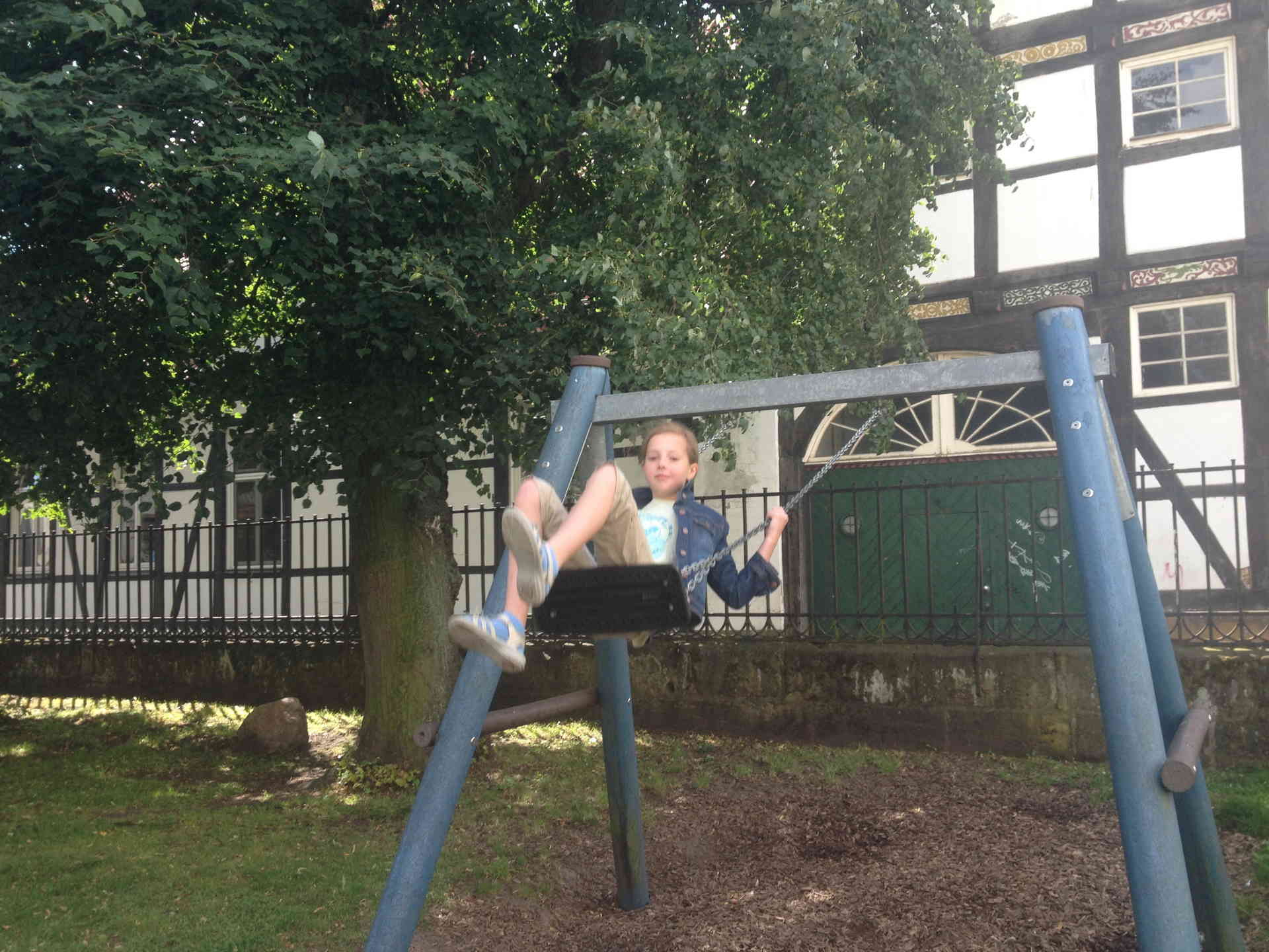 Nachdem wir geklärt haben, dass man nie zu alt ist, um einen Höhenflug zu genießen, für den man nichts zu tun braucht, darf ich anschubsen … dieser kurze thrill , wenn die Schaukel ganz oben still in der Luft zu stehen scheint … am tiefsten Punkt aufgefangen werden … und der nächste Schwung trägt noch höher … Glück ist, wenn man in den Himmel fliegt. Und zum Schluss die Mutprobe: Abspringen im Flug. »Das habe ich mich früher, als ich kleiner war, nie getraut.« Kuckst du, geht doch!