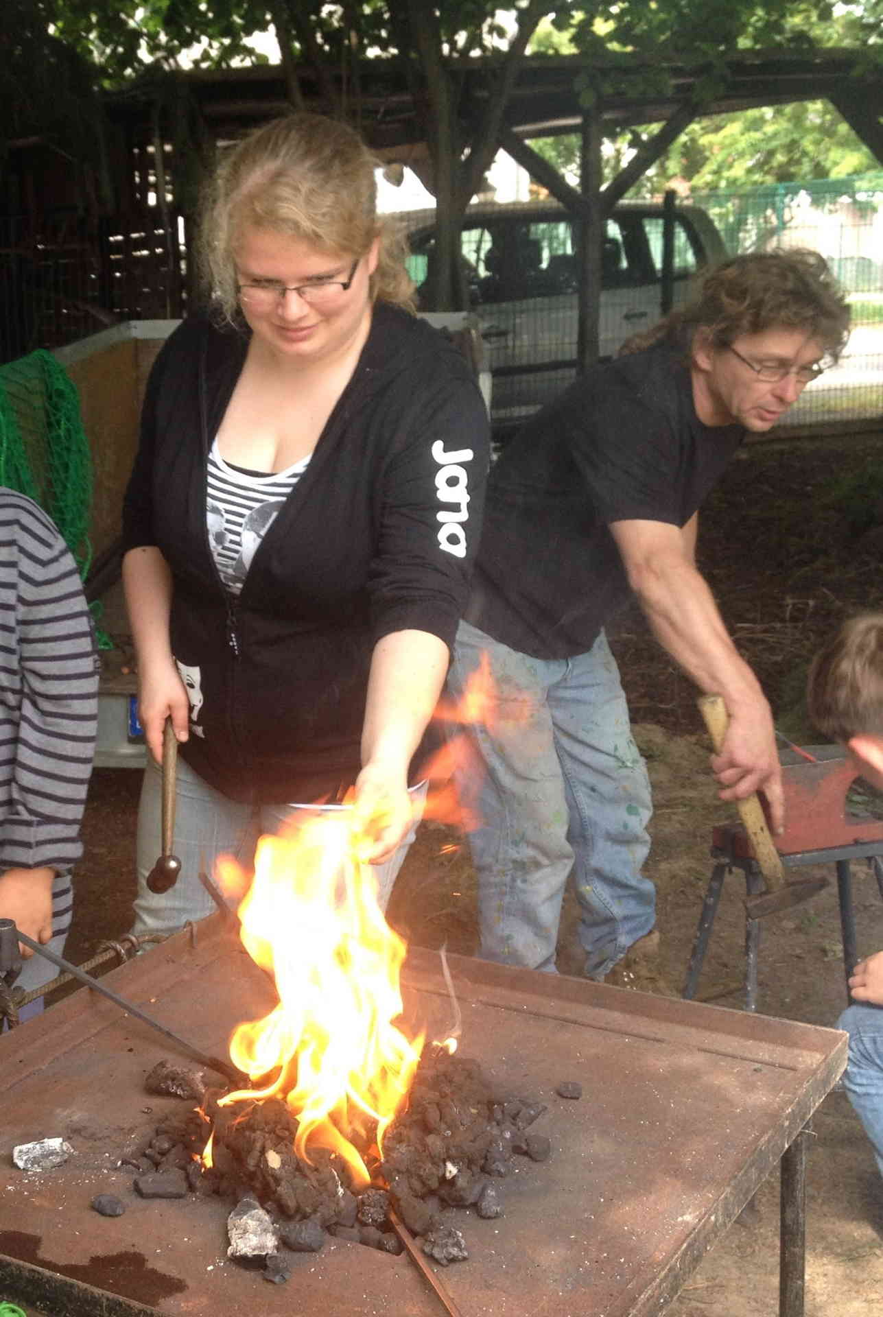 Sie wechseln sich ab: während der eine sein Werkstück in die Glut hält bearbeitet die andere die glühende Spitze ihres Werkstücks auf dem Amboss.