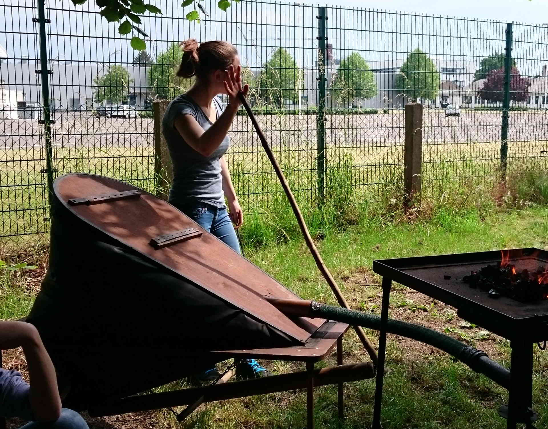 Dann ist es soweit: die Schmiede ist fertig. Spezielle Steinkohle für über 1000°C glüht in der Esse, kaltes Wasser für Werkstück und Werkzeug steht in einem Eimer bereit, das Wasser im anderen Eimer ist dafür da, um Hände und Arme abzukühlen, für jeweils zwei Lehrlinge gibt es einen Amboss.
